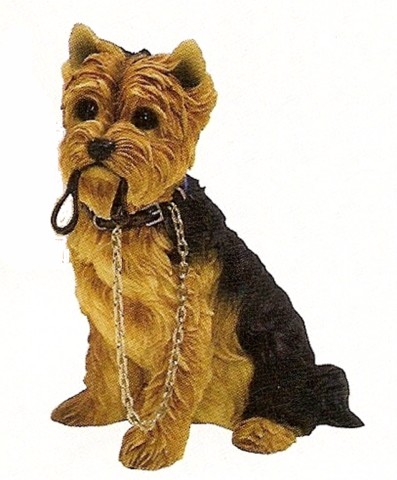 Hundefigur Yorkshire Terrier sitzend mit Leine im Maul