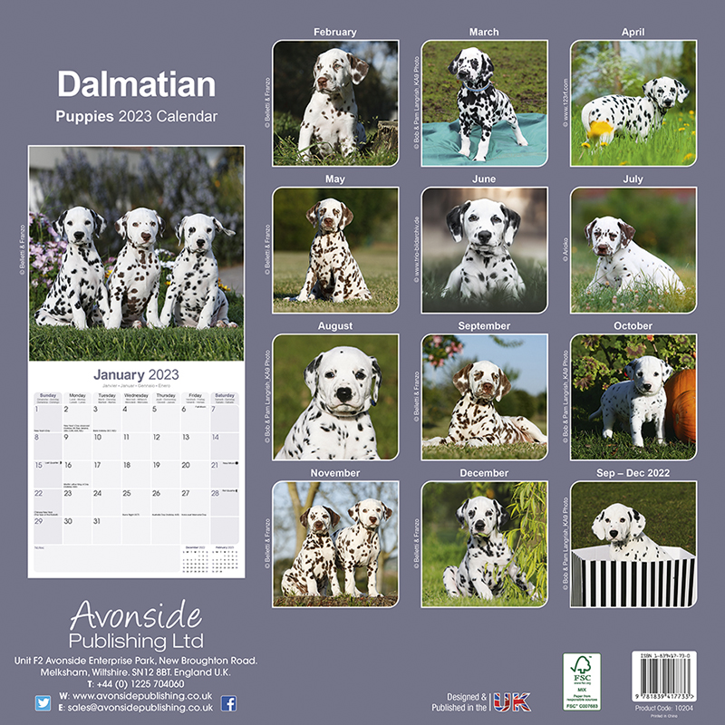 Kalender für das Jahr 2023 mit 13 wunderschönen Dalmatiner Welpen Fotographien.