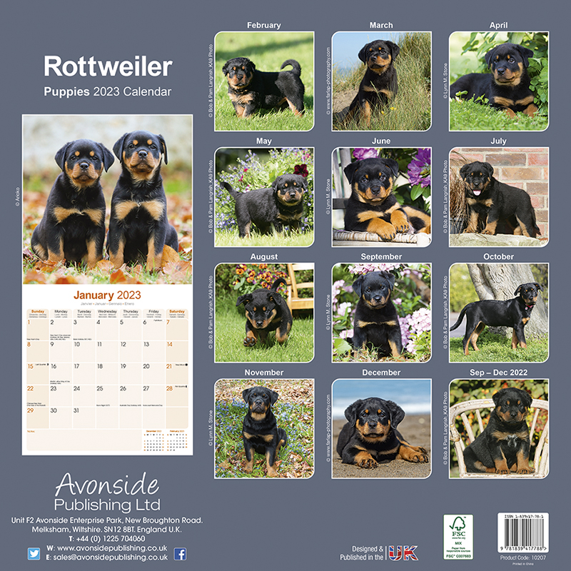 Kalender für das Jahr 2023 mit 13 wunderschönen Rottweiler Welpen Fotographien.