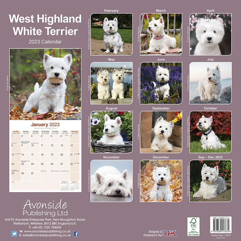Kalender für das Jahr 2023 mit 13 wunderschönen West Highland Terrier Westie Fotographien.