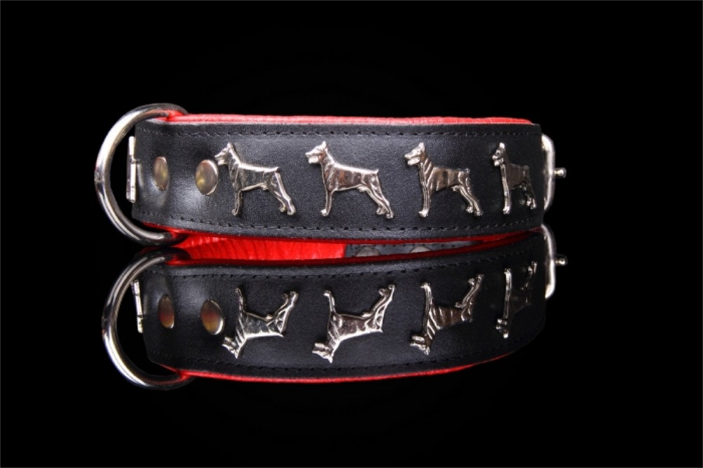 4 cm breites Motivhalsband Dobermann Aus super weichem Vollrindleder ist mit Softleder unterlegt. Die Beschläge und Motive sind verchromt.